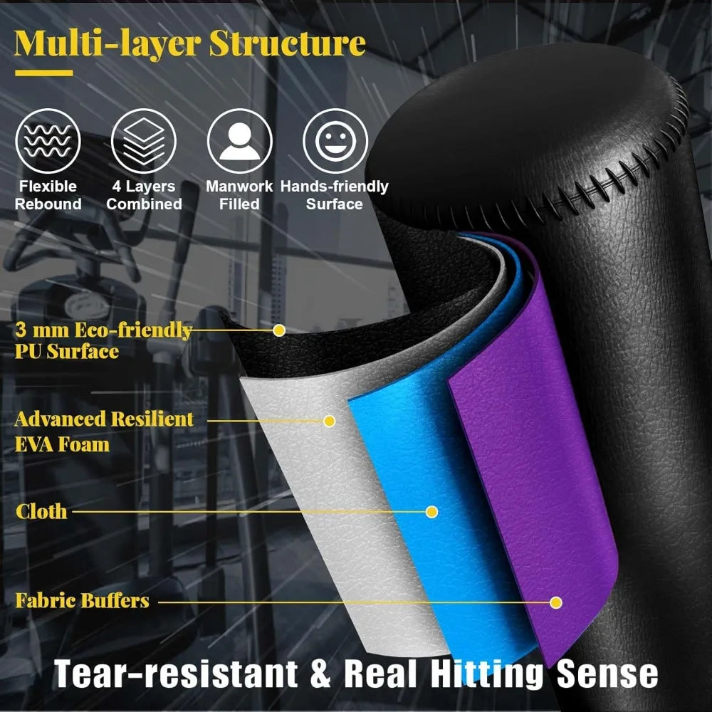 - 【Heavy Duty Boxing Bag】: Constructed with multi-layer construction, each layer has been carefully engineered: stainless steel tube prop, eco-friendly fabric buffer, high-density EPE foam, 3mm Premium PU Leather. Generates tear-resistant, fast rebound, good hardness balance and hands protective surface.